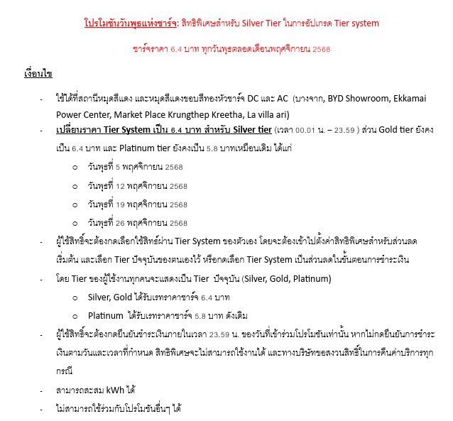 โปรโมชันสถานี: วันพุธแห่งชาร์จ 6.4 บาท (สำหรับ Silver, Gold) ตลอดวันพุธในเดือนพฤศจิกายน ส่วน Platinum เป็น 5.8 บาทดังเดิม