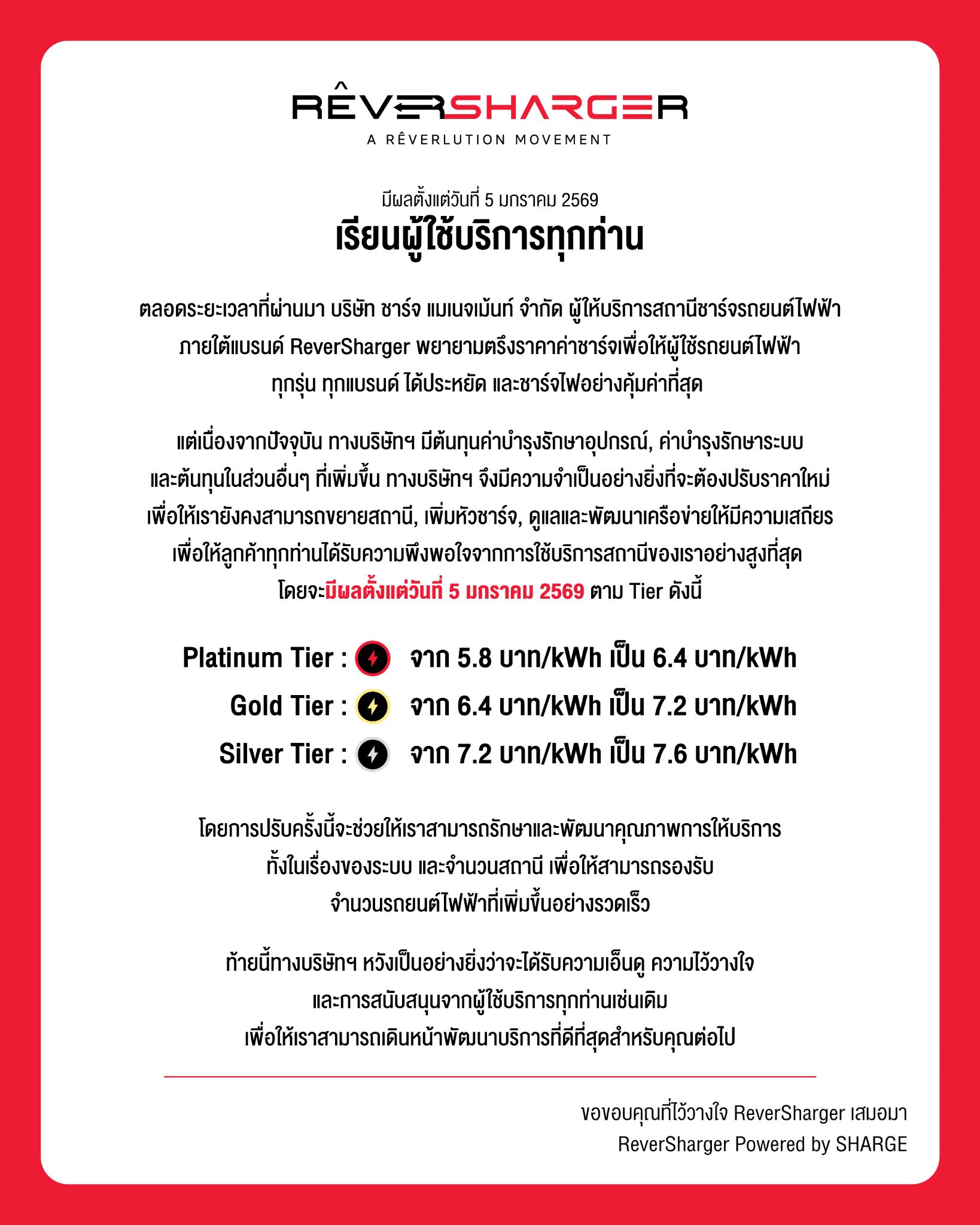 - Silver (ระดับเริ่มต้น): อัตราค่าชาร์จ: 7.2 บาทต่อ kWh (ปรับราคา 7.6 บาทต่อ kWh เริ่ม 05/01/2569)