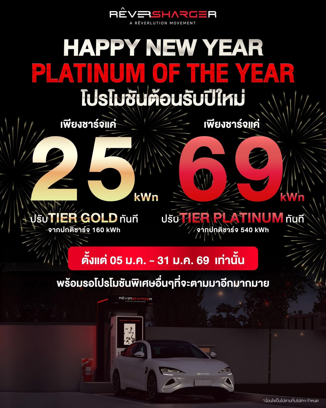 สำหรับผู้ใช้งานที่มียอดการชาร์จพลังงานไฟฟ้าถึง 160 kWh ภายใน 6 เดือน - Platinum: อัตราค่าชาร์จ: 5.8 บาทต่อ kWh (ปรับราคา 6.4 บาทต่อ kWh เริ่ม 05/01/2569)