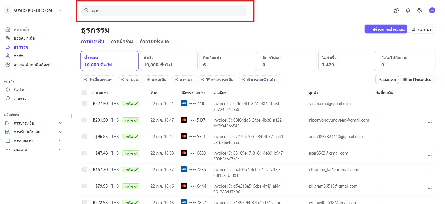4. จะแสดงข้อมูลดังภาพ จากนั้นนำข้อมูลอีเมลลูกค้า หรือ เลข Invoice จากระบบ CMS มาวางที่ช่อง ค้นหา จะแสดงข้อมูลประวัติการชำระเงินของลูกค้าทั้งหมด ซึ่งระบบจะแสดงข้อมูลดังนี้